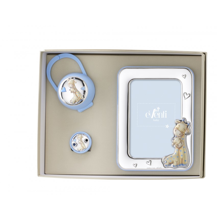 Set pinza porta chupetes y marco 10x15 jirafa azul