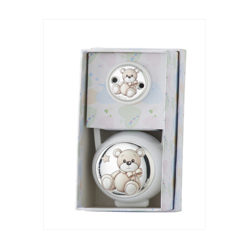 Set porta chupetes y pinza oso lazo blanco