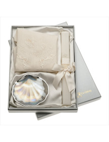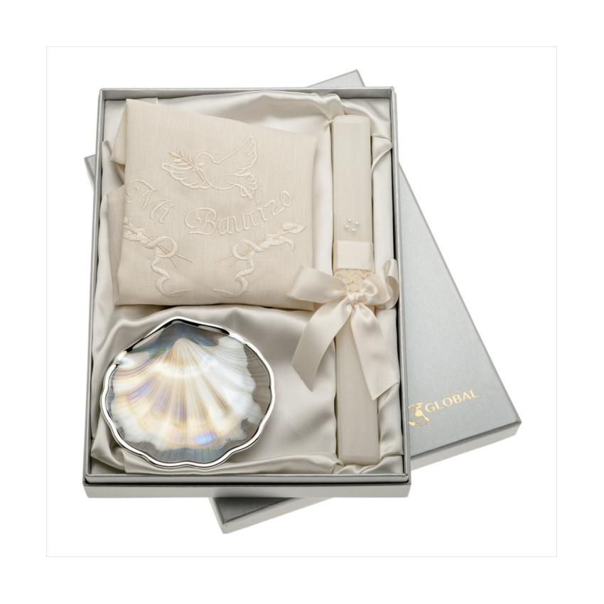 Set bautismo vela+paño español+concha m.perla plateada