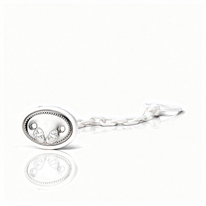 Pinza chupete grabar patucos blanca con Plata.