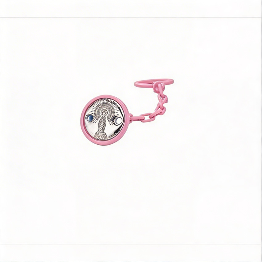 Pinza para chupete con cadena en color rosa de la virgen del Pilar y aplicación con Plata Bilaminada