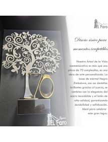 Nuestro Árbol de la Vida conmemorativo es más que una placa de 70 cumpleaños, es una obra de arte personalizada. La base de mármol Negro Zimbabwe, con sus destellos brillantes gracias al cuarzo, se combina con la elegancia del acero inoxidable y el latón de alta calidad, garantizando durabilidad y sofisticación. Ideal para celebrar este gran logro.
